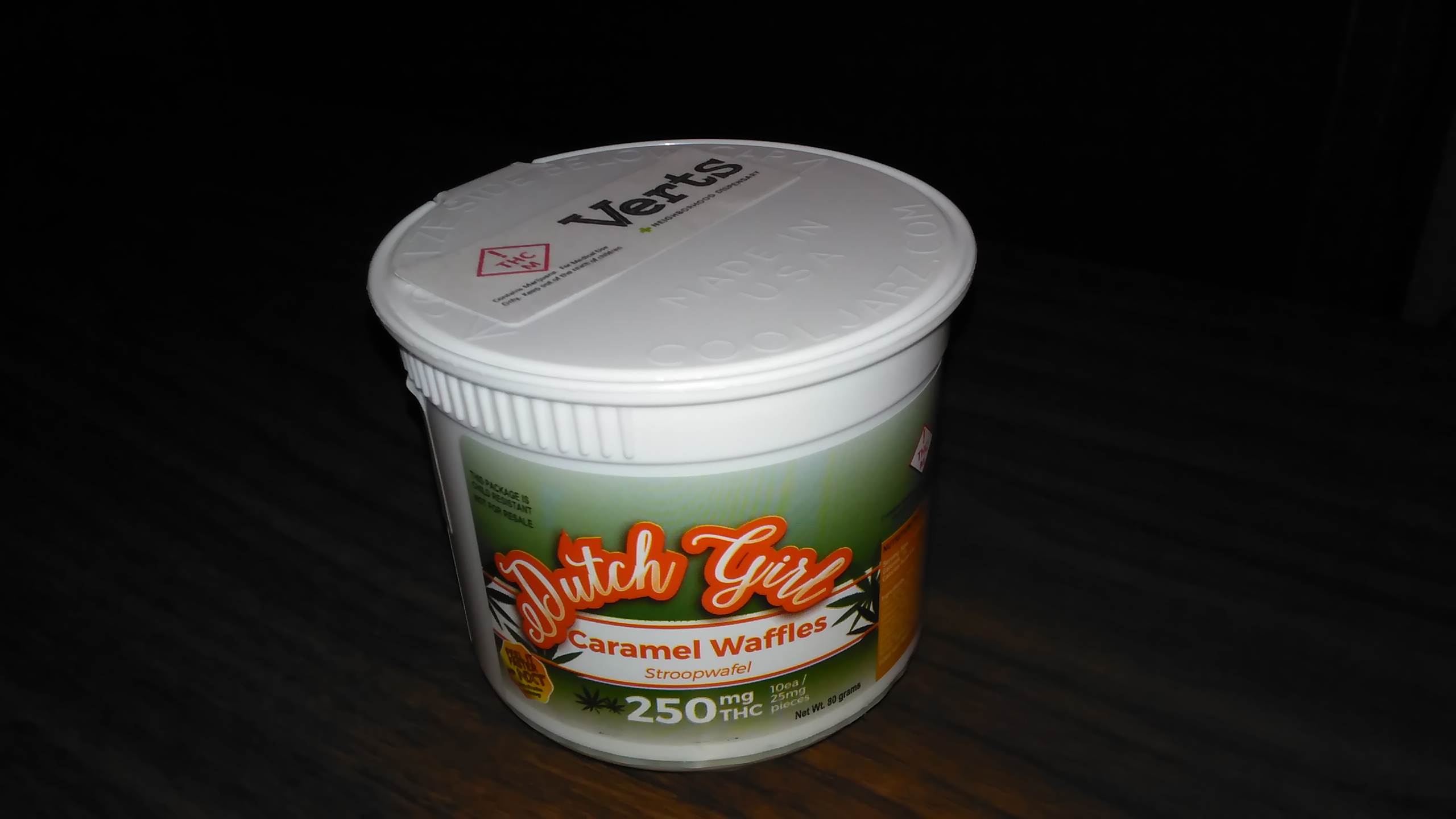 Product: Dutch Girl Caramel Waffles (Stroopwafel) 250 mg THC (10 each/25 mg pieces). Produced by the good people at the CannaPunch Company in Denver, Colorado. In business since 2009 according to their website.