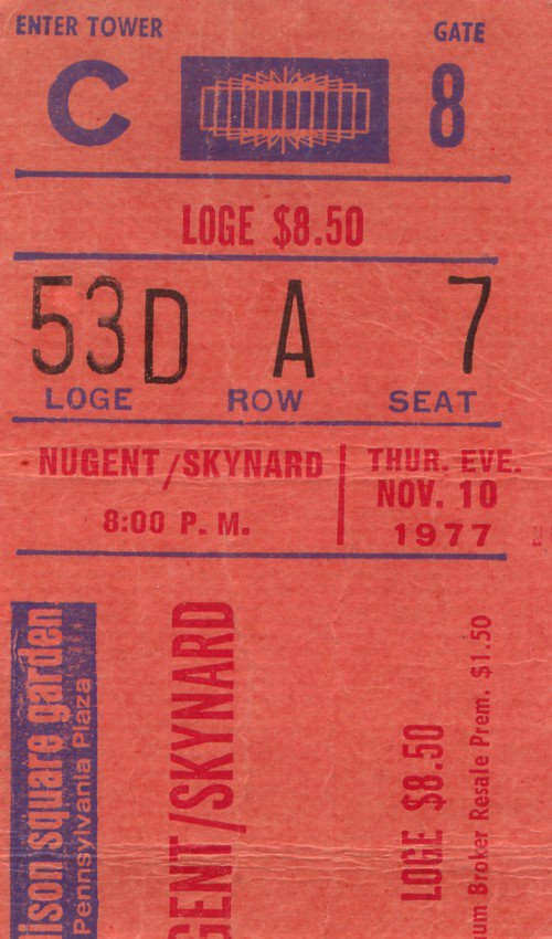 From the Gary “Uncle G” Classic Rock Ticket Stub Collection: Ted Nugent – Lynyrd Skynyrd – Misspelled “Skynyrd“.