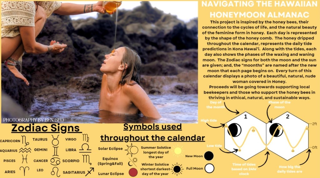 So get this, besides selling the best-tasting honey ever (in my opinion), Honey Bee Sensual just happens to be selling a calendar with the most beautiful photography you’d ever want to see. Proceeds according to their website: “go to help local beekeepers and those who support the honey bees in thriving in ethical, natural, and sustainable ways.” It also focuses on and embraces nudity and naked ladies who reside in Hawaii, who are into bees, and the nectar they create, either as a complete novice around these wonderful creatures, or someone experienced, free-spirited, and who goes by the cool title of, beekeeper. Nothing too graphic or terribly obscene.